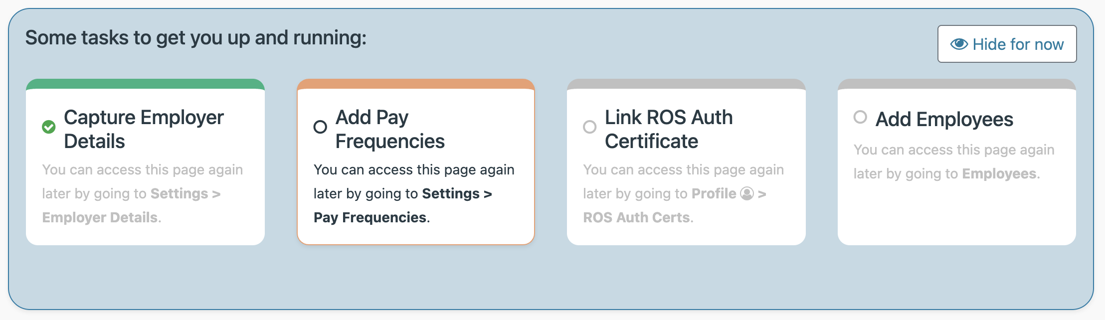 You will be guided through your payroll setup via the Payroll Setup card. You can hide and access this card in the same way as the Company Setup card.