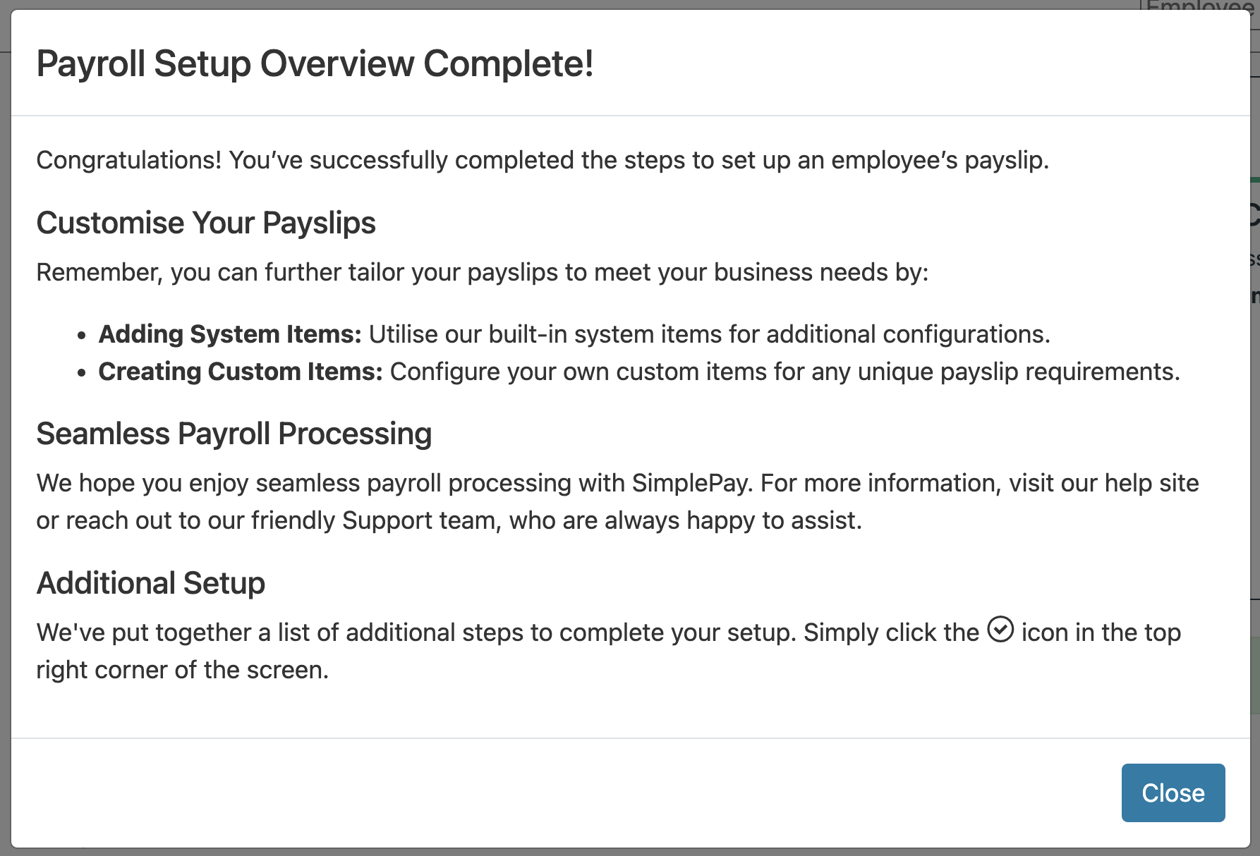 Note that you don't need to complete 100% of the Getting Started Checklist in order to start processing payroll; however, doing so will greatly improve your experience on SimplePay.