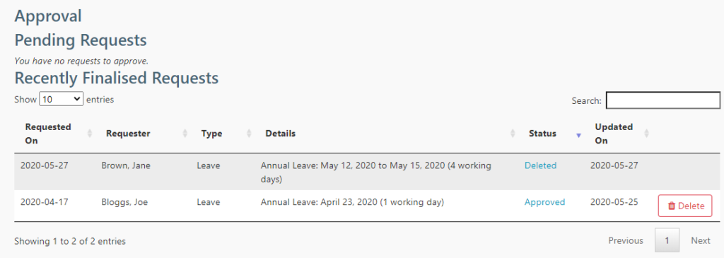 • If the Retain these leave dates? box is unchecked when clicking Delete Request, then the leave request will be deleted, and the leave days that form part of the request will be deleted from the calendar and added back to the leave balance for that leave type.
