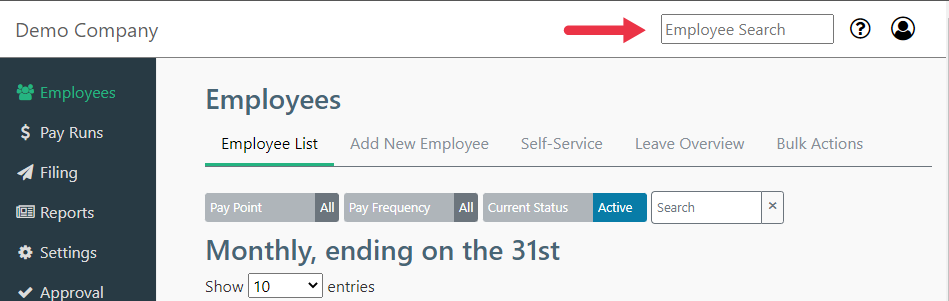 The Employee Search Bar can be located in the top right corner of the SimplePay system.